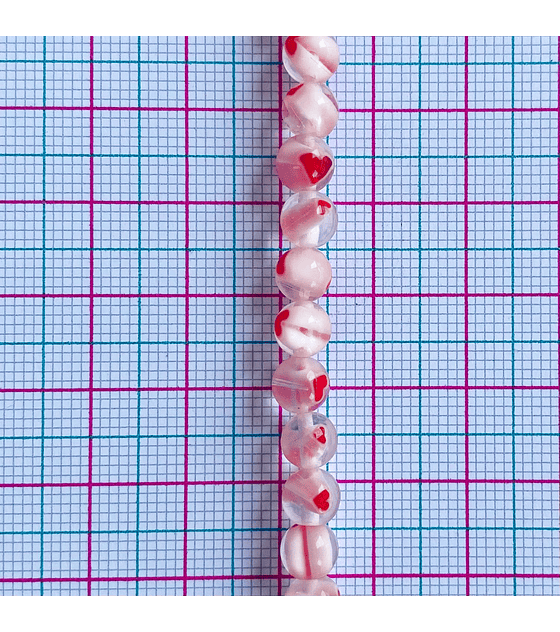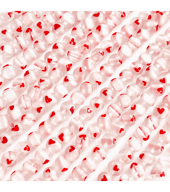 Es un abalorio decorativo utilizado en la elaboración de bisutería artesanal y accesorios creativos. Esta cuenta de vidrio destaca por su técnica de murrina, que permite incluir en su interior un pequeño corazón, aportando un detalle romántico y colorido a pulseras, collares, aretes y tobilleras hechas a mano. Su tamaño compacto de 6 mm la hace ideal como separador o elemento central en diseños de joyería delicada.