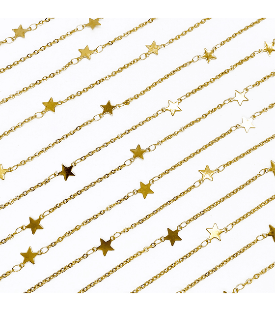Ideal para la creación de collares, pulseras y tobilleras con un estilo juvenil y sofisticado. Su diseño fino con detalles de estrellas permite técnicas de ensamblaje, combinación con dijes pequeños, charms o cuentas decorativas, y proyectos de bisutería artesanal y joyería DIY que busquen un acabado moderno, brillante y llamativo. Palabras clave: cadena acero con estrellas doradas en latón, bisutería celestial, accesorios delicados, collares y pulseras finas, materiales para joyería artesanal.
