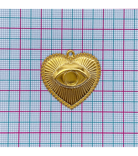 Este dije en forma de corazón con detalle de ojo turco en relieve, elaborado en latón con baño de oro, es una pieza llamativa que combina el simbolismo del amor y la protección espiritual. Su diseño en relieve bien definido aporta textura, brillo y un estilo moderno, ideal para destacar en piezas artesanales o de autor.
