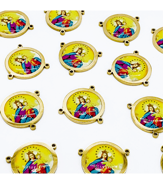 Es un colgante decorativo para bisutería y accesorios religiosos, elaborado en acero resistente con acabado dorado y detalles en resina que representan la imagen de María Auxiliadora. Su diseño combina elegancia y simbolismo, ideal para crear piezas con valor espiritual y estético.