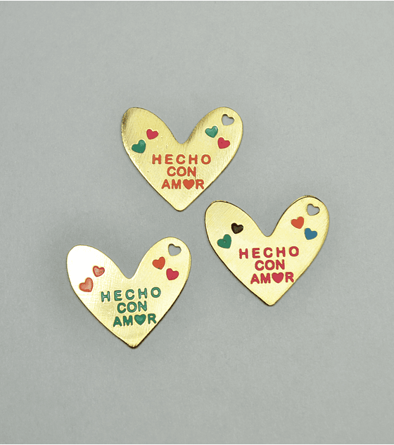 DIJE CORAZÓN CON FRASE " HECHO CON AMOR " GRABADA EN LATÓN Y PINTADO EN COLORES