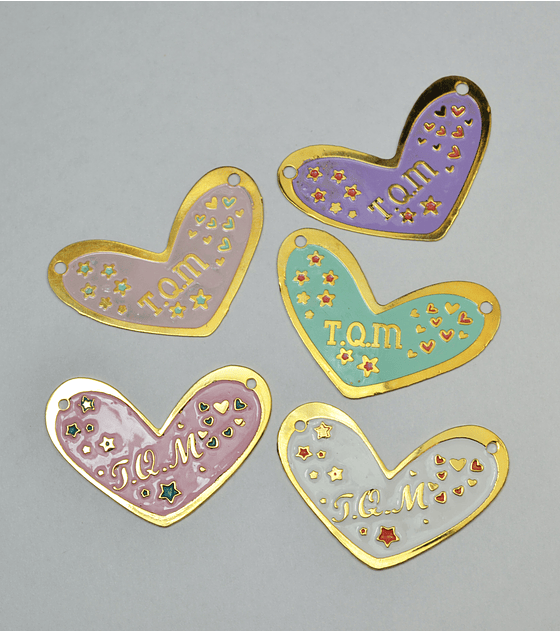 DIJE CORAZÓN CON FRASE " T.Q.M" GRABADA EN LATÓN Y PINTADO EN COLORES
