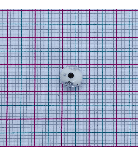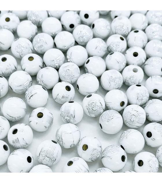 Separador en forma de bola plástica de 8 mm en color blanco, decorado con un grabado de San Benito en acabado plateado.