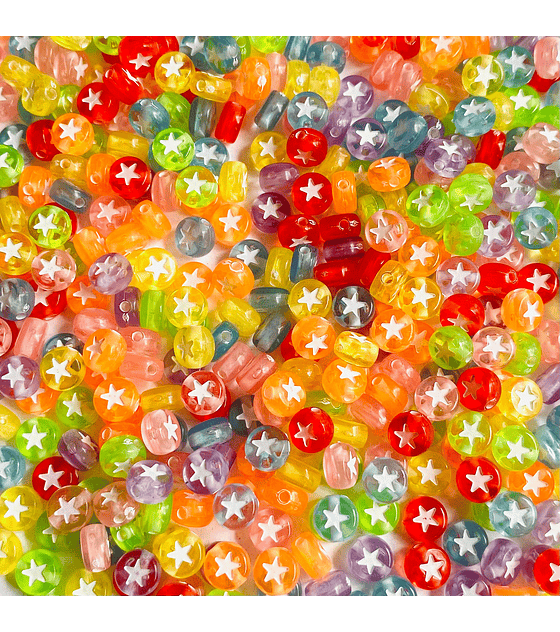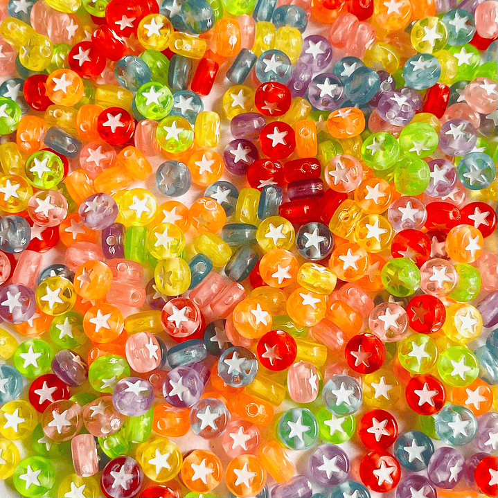 Es una cuenta decorativa utilizada en la elaboración de bisutería artesanal y accesorios creativos. Este abalorio destaca por su diseño llamativo, donde una estrella central resalta sobre un fondo blanco combinado con tonos translúcidos que permiten el paso de la luz, aportando un efecto colorido y moderno a pulseras, collares, aretes y tobilleras hechas a mano. Su forma tipo pastilla lo hace ideal para crear contrastes y agregar un detalle especial dentro de los diseños de joyería.