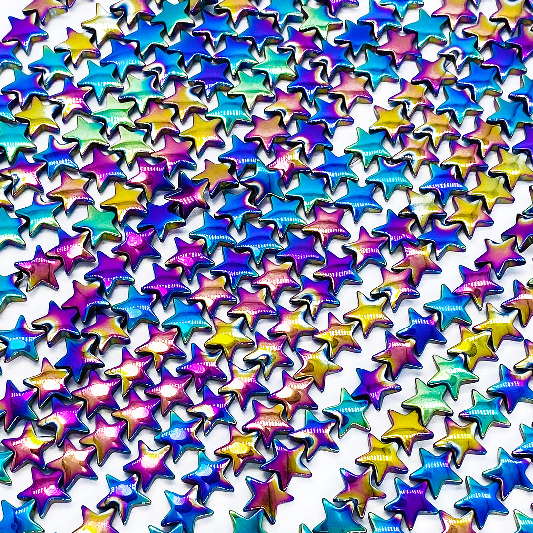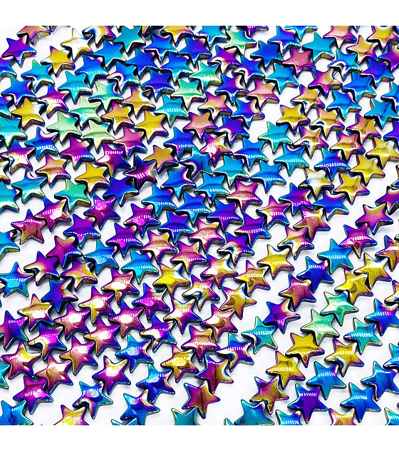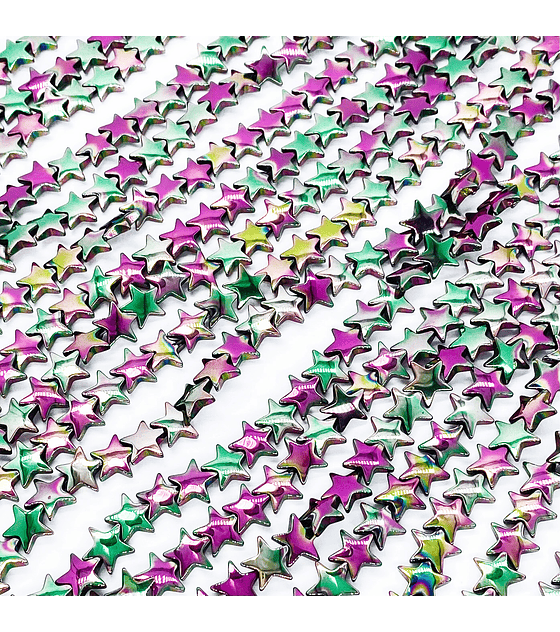 Es un accesorio metálico para bisutería diseñado para trabajar con cuentas, perlas o cristales de 8 mm, aportando un acabado iridiscente con reflejos tornasolados que realzan cada diseño. Su forma de estrella permite separar y destacar los elementos de manera armoniosa, agregando brillo y un detalle moderno en collares, pulseras y tobilleras. Este insumo es ideal para técnicas como armado con cadena, alambrismo, ensamble de cuentas, macramé decorativo y combinación con dijes o charms. Es un material versátil para diseñadores que trabajan accesorios, fornituras metálicas, elementos para bisutería artesanal y joyería creativa, ofreciendo estética, ajuste perfecto y acabado profesional para emprendimientos y tiendas de insumos en toda Latinoamérica.