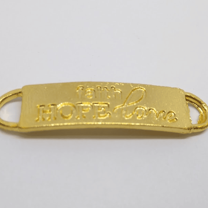 DIJE DOBLE ARGOLLA PLACA FRASE " FAITH HOPE LOVE " GRABADA EN ZAMAK BAÑO DE ORO