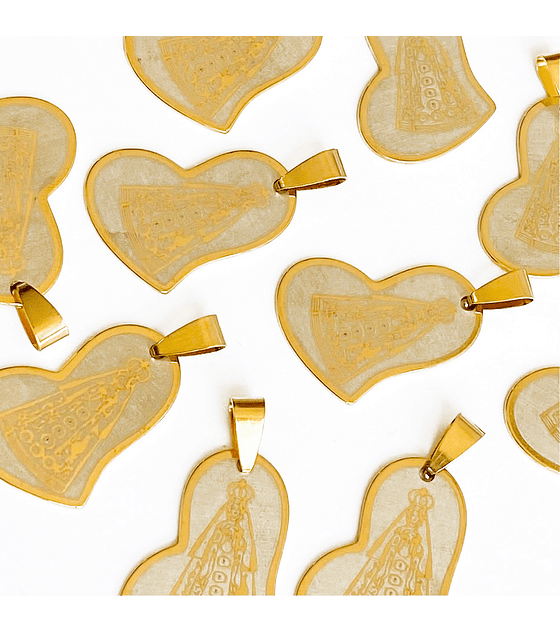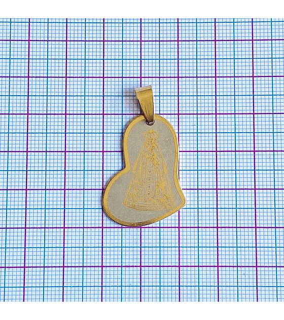 MEDALLA VIRGEN DE CHIQUINGURÁ FORMA DE CORAZÓN EN ACERO DORADO